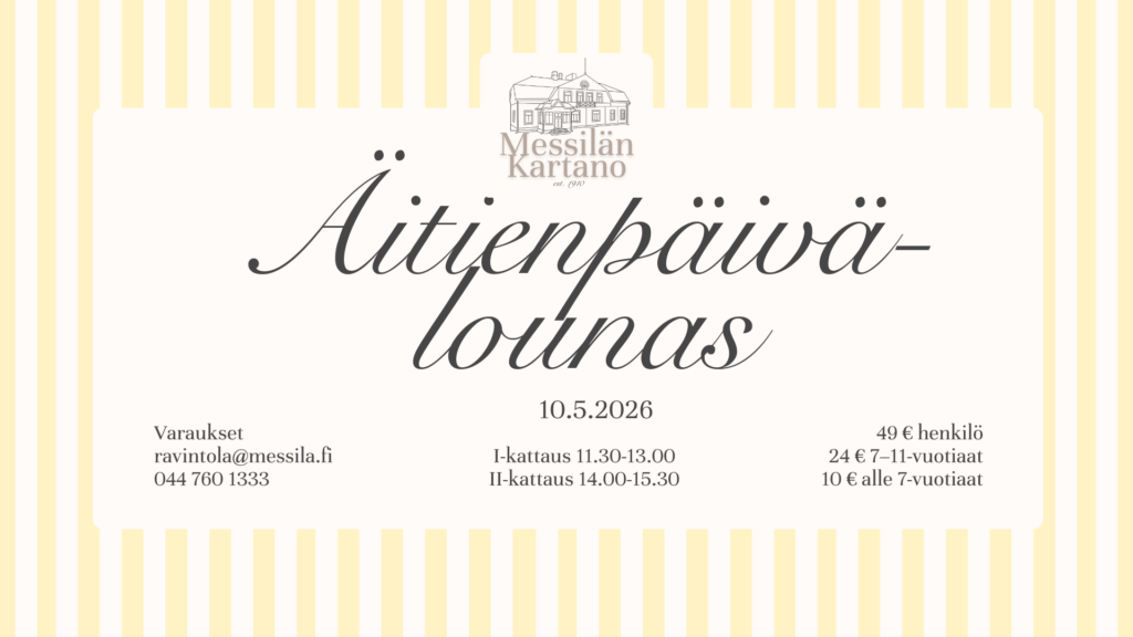 Messilä tarjoaa monipuoliset ravintolat ja juhlatilat kokouksiin, häihin, juhliin ja muihin tapahtumiin ympäri vuoden Lahden lähellä. Ravintoloihimme kuuluvat Kartanoravintola, Markkinaravintola, Kahvila Laaso sekä Bistro.