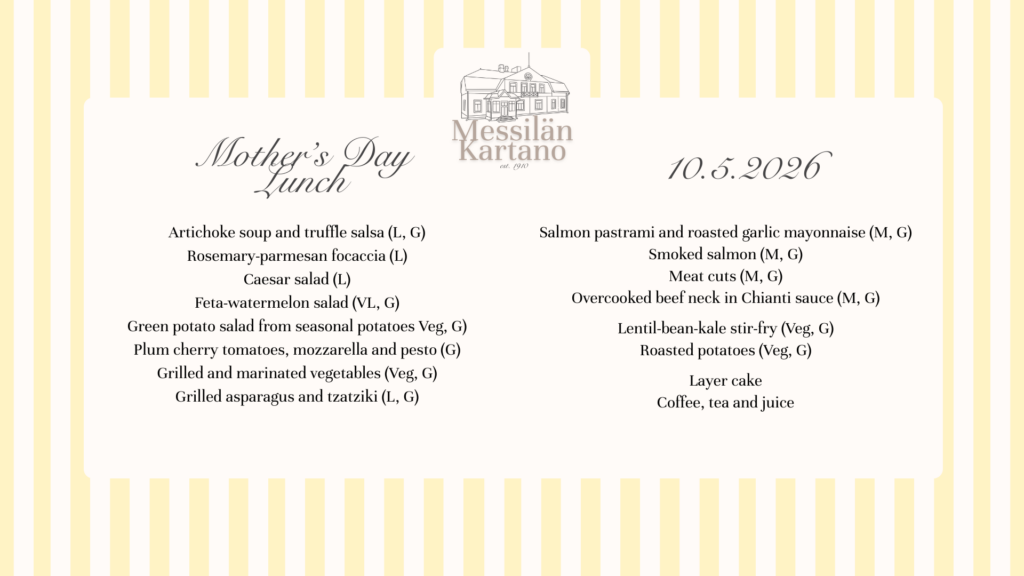 Table reservations by phone +358447601333 or by email ravintola@messila.fi.